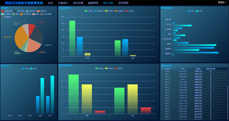 現階段可對地質(zhì)災害入庫數據進(jìn)行智能統計分析,涵蓋地災類(lèi)型、風(fēng)險等級、特殊敷設段、銷(xiāo)號點(diǎn)、易發(fā)分區、巡檢更新等統計分析(圖 6)。
