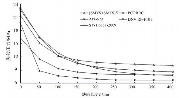 (2)當缺陷長(cháng)度小于某一數值時(shí),上述五種方法的評價(jià)保守性從低到高依次為DNV RP-F101、PCORRC、ASME B31G-2012、SY/T 6151―2009、API-579;大于該值時(shí),總體來(lái)說(shuō)評價(jià)方法的保守性從低到高依次為B31G、DNV RP-F101、PCORRC、SY/T 6151―2009、API-579。
