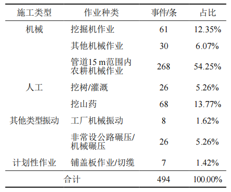 通過(guò)事件復核及現場(chǎng)反饋,全年共發(fā)現預警事件494次,其中主要為機械施工占比72.67%(圖 3),人工挖掘施工占比19.01%。表明預警能夠對機械事件和人工深層次挖掘、持續性挖掘及作業(yè)計劃事件進(jìn)行準確預警與定位。