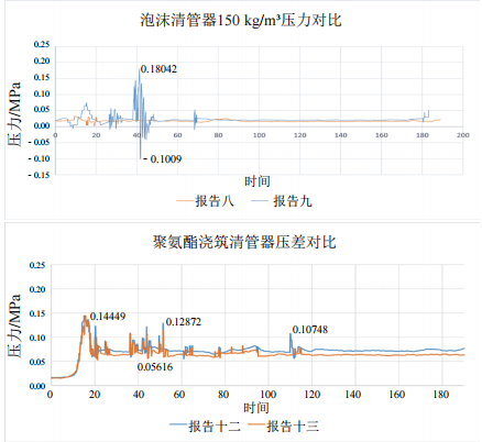 (1)密度為130 kg/m3的泡沫清管器運行壓差最小,運行期間壓力波動(dòng)最小。
