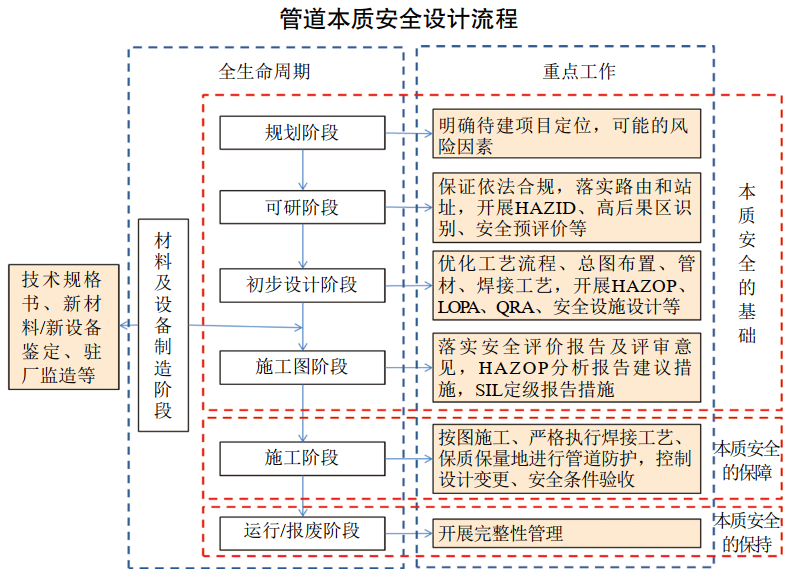 (2)全生命周期原則。管道本質(zhì)安全設計從項目規劃開(kāi)始,要貫穿全生命周期可行性研究、初步設計、施工圖設計、材料/設備制造、施工、運行及報廢的整個(gè)過(guò)程。每個(gè)階段有其重點(diǎn)任務(wù)和工作程序。整個(gè)過(guò)程是一個(gè)從宏觀(guān)到微觀(guān)、從整體到細節、由淺入深由虛到實(shí)的過(guò)程,同時(shí)也是一個(gè)風(fēng)險不斷被識別、不斷被評估和應對的過(guò)程。