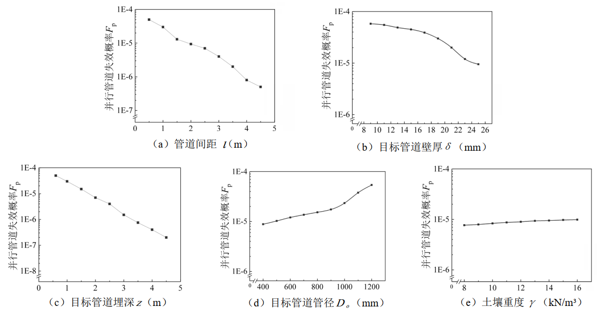 (1)并行管道設計階段,各參數對并行管道失效概率影響程度從大到小依次為管道水平間距、土壤埋深、管道壁厚、管道內徑、土壤重度。