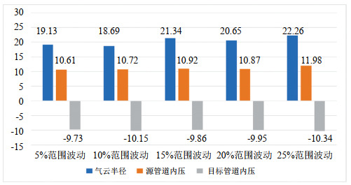 (2)并行管道運行階段,影響程度大小排序為氣云半徑、源管道內壓、目標管道內壓。
