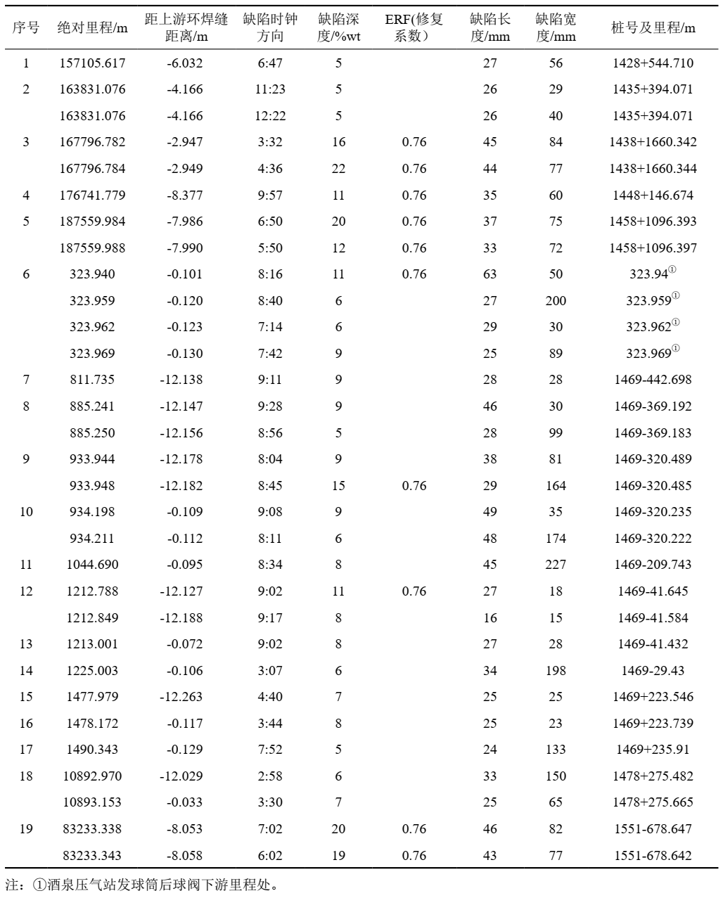 經(jīng)排查梳理,該段管道(壁厚14.6 mm)共存在19處外部金屬損失缺陷點(diǎn)(缺陷深度均小于20% wt),詳見(jiàn)表 1。