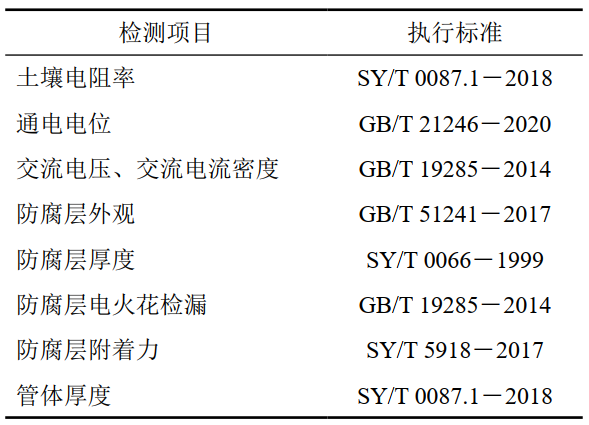 兩處檢測點(diǎn)按“測試樁編號+偏移距離”分別命名為KP10-809.5 m和KP12+281 m。首先對兩處液體聚氨酯管道補口進(jìn)行現場(chǎng)檢測及樣品采集。其中,土壤檢測主要為管道補口附近土壤電阻率測試及樣品采集,評估土壤腐蝕性;防腐層檢測主要包括防腐層外觀(guān)、厚度、漏點(diǎn)和附著(zhù)力等檢測及剝離防腐層采樣,評價(jià)管道補口防腐層質(zhì)量;電位測試包含管道通電電位(補口位置與上下游智能測試樁距離較遠,不具備采集管道斷電電位條件)、交流電壓和交流電流密度采集,評估管道陰極保護有效性和交流干擾狀況;防腐層下方管體壁厚測試以評估腐蝕類(lèi)型和程度。各項測試執行標準見(jiàn)表 1。