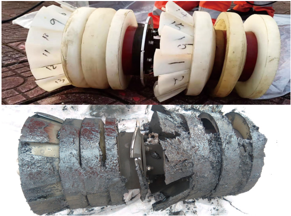 (3)檢測器皮碗耐磨性不夠[2]。常規聚氨酯皮碗在有內涂層管道中磨損量小,長(cháng)距離檢測也能保持較好密封性和驅動(dòng)能力,但在無(wú)內涂層管道大量金屬粉末磨損下,加之檢測器運行不暢頻繁啟停,皮碗磨損及偏磨加劇,運行速度越慢,動(dòng)摩擦系數越大,皮碗磨損越嚴重[3],使其在后段運行中驅動(dòng)力不足。圖 4為漏磁檢測器檢測前后皮碗磨損情況分析。通過(guò)測量得知,驅動(dòng)前端皮碗磨損量15%,唇邊厚度磨損80%;驅動(dòng)后端皮碗磨損量15%,唇邊厚度磨損92%,幾乎磨完。驅動(dòng)鋼刷磨損在合適范圍。