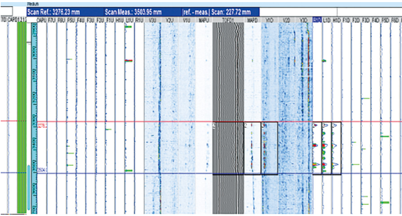 全自動(dòng)超聲波掃查圖分為上游通道、上游體積通道、上游根部體積通道、TOFD通道、下游根部體積通道、下游體積通道、下游通道帶狀圖,主要對各通道檢測信號進(jìn)行識別并據此評判根焊缺陷情況。
