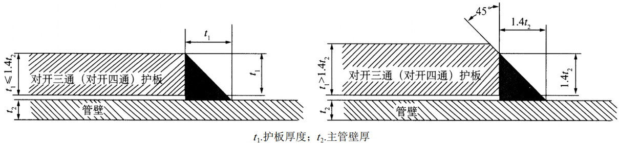 (1)三通焊接。嚴格按照GB/T 28055―2011要求定位三通安裝間距,測量三通環(huán)焊縫位置的管道實(shí)際壁厚,結合標準給出的許焊壓力計算公式再次計算確認焊接位置。焊接前必須進(jìn)行焊接工藝交底,焊接過(guò)程嚴格執行焊接工藝規程,落實(shí)預熱、多排多道、單層焊接厚度、回火/退火焊道等要求,保證焊接質(zhì)量,預防焊接裂紋,減少應力集中。直焊縫焊接應加墊鐵以保護管道不與電弧直接接觸;兩端加引護板并在焊接完成后切除,避免在三通本體上引弧和收弧,有利于減少缺陷產(chǎn)生。環(huán)焊縫焊接時(shí)嚴格按照SY/T 6150―2017和焊接工藝要求控制角焊縫的焊角尺寸(圖 4),既要保證焊縫強度,同時(shí)還要盡量降低焊縫位置的應力集中。