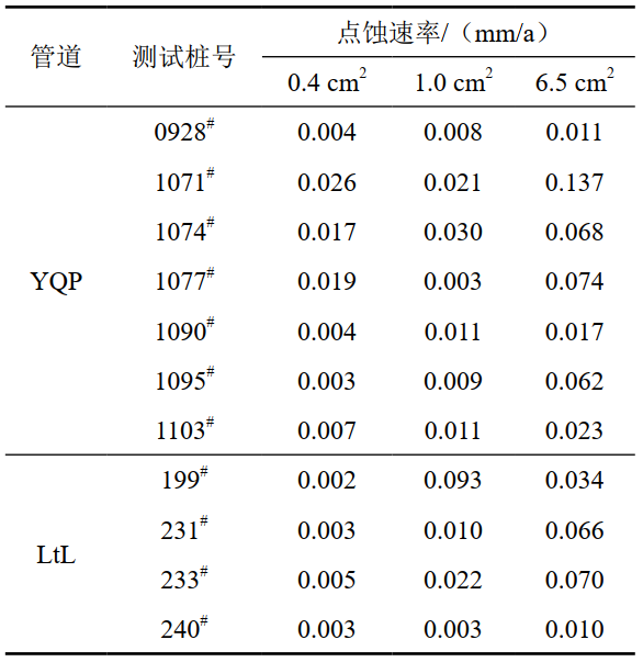 以YQP管道928#、1074#和1077#這3處為例,自腐蝕試樣點(diǎn)蝕速率和陰極保護試樣最大點(diǎn)蝕速率分別為0.312 mm/a,0.011 mm/a;0.281 mm/a, 0.068 mm/a;0.234 mm/a,0.074 mm/a。根據GB/T 21447-2018《鋼質(zhì)管道外腐蝕控制規范》,3處土壤腐蝕性等級均為中,施加陰極保護后均降為弱?梢钥闯,陰極保護試樣點(diǎn)蝕速率遠遠小于沒(méi)有陰極保護的自腐蝕試樣點(diǎn)蝕速率,表明試驗管段陰極保護系統可以大幅度降低管道腐蝕速率,為管道提供良好保護。