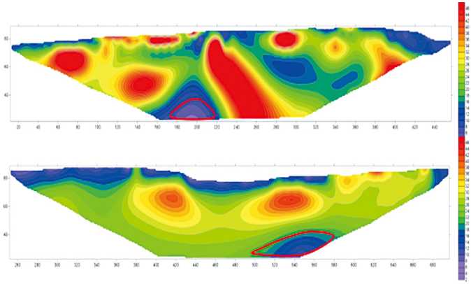 管道附近共完成5條高密度電法剖面(分別為W1、W2、W3、W4和W5測線(xiàn)),可探測有效深度根據剖面長(cháng)短而定。依據高密度電法反演成果圖,對礦區采空區進(jìn)行分析。以W1測線(xiàn)為例,根據現場(chǎng)踏勘推測采空區范圍在里程120 m~200 m和390 m~600 m之間。里程170 m~220 m標高22 m~40 m存在視電阻率值小于15 Ω·m區域,推測該位置為采空區,采空區頂板位置大約在標高40 m處。同理,里程485 m~590 m標高14 m~44 m地層視電阻率值小于15 Ω·m,推測該位置為采空區,采空區頂板位置大約在標高44 m處(圖 5)。