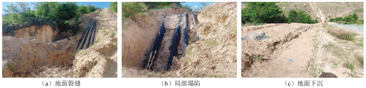 為了避免后期誘發(fā)地震及大面積塌陷,現代采煤技術(shù)在工作面回采過(guò)程中往往采用放頂措施,即工作面采完后讓煤層的頂部自然沉降。在沉降過(guò)程中,頂板受到覆蓋層的重力作用,從下到上依次將崩塌、變形傳遞到地表,導致地表形成大面積的裂縫(圖 1-a)、局部塌陷(圖 1-b)、下沉(圖 1-c)等地質(zhì)災害。鋪設在上方的管道由于外力作用使原有的平衡被打破,往往出現拉伸、擠壓、剪切、扭轉、彎曲變形,甚至出現管道斷裂情況。