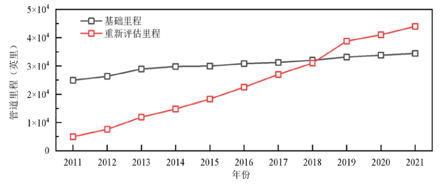 圖 3 美國各年度基礎管道里程和重新評估管道里程