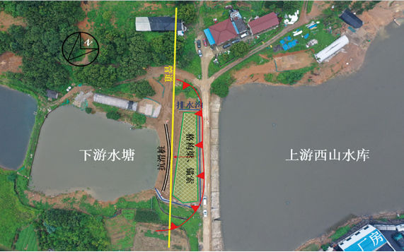 甬滬寧輸油管道于2004年建成投產(chǎn),設計年輸油能力為2000×104 t,承擔著(zhù)向揚子石化、金陵石化及長(cháng)江上游各大煉化企業(yè)輸送原油的重要任務(wù)。該管道經(jīng)過(guò)江蘇省句容市西山水庫堤壩東側坡腳,與大壩走向平行,埋深約1.5 m。西山水庫已建成約20年(圖 1),堤壩主體為人工填土堆筑形成,由于土質(zhì)不均,松散欠密實(shí),局部存在較大孔隙、空隙。水庫上游庫區護坡已存在較多凹陷、塌陷并形成管涌土洞,堤壩下游為地勢較低的水塘,土體常年飽水、滲水,坡面曾多次發(fā)生過(guò)淺表滑塌、小型滑坡。一旦發(fā)生較大或較深滑坡,將嚴重威脅管道運行安全。