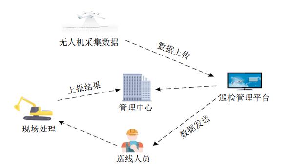 (2)無(wú)人機與機庫組合巡護作業(yè)流程。根據巡護作業(yè)安排,通過(guò)巡檢管理平臺事先規劃無(wú)人機巡護航線(xiàn)。無(wú)人機從機庫自動(dòng)起飛按規劃航線(xiàn)飛行,空中采集管道及其周邊影像數據,通過(guò)數據鏈路即時(shí)回傳至監控調度中心,經(jīng)分析處理按風(fēng)險隱患預警等級實(shí)時(shí)發(fā)布,并將管道導航坐標推送到相關(guān)人員移動(dòng)終端及時(shí)排查處置,結果反饋監控調度中心。無(wú)人機與機庫組合巡護流程如圖 2所示。