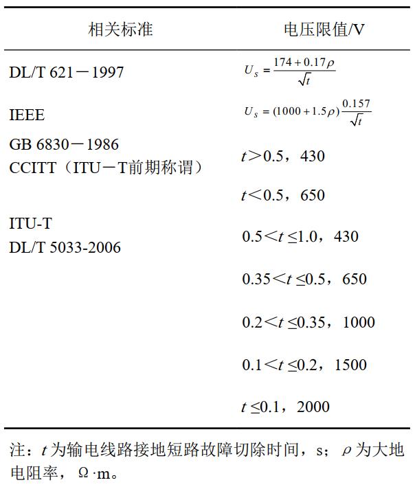 (3)輸電線(xiàn)路故障狀態(tài)下的安全限值。目前國內最常用的管道防腐層材料為3層PE和FBE(熔結環(huán)氧粉末)。根據國內試驗結果,這兩種防腐層材料的瞬時(shí)安全電壓限值一般都能達到幾十千伏,遠遠高于管道防腐層上可能出現的最大涂層電壓。因此,以短時(shí)人體安全電壓限值作為判定交流輸電線(xiàn)路與管道安全距離的標準,也是一種常用選擇。短時(shí)作用下的人體瞬間安全電壓有關(guān)標準如表 2所示。GB 6830―1986采用了CCITT的推薦值。但根據世界各國現場(chǎng)運行經(jīng)驗,CCITT的推薦值偏于保守。正是出于這種認識,ITU-T(國際電信聯(lián)盟)建議對高可靠輸電線(xiàn)路的感應電壓允許值按故障切除時(shí)間分等級,故障切除時(shí)間越短,危險影響標準越高,如表 2中所示限值。據此,我國在DL/T 5033―2006《輸電線(xiàn)路對電信線(xiàn)路危險和干擾影響防護設計規程》中采用了這一建議。