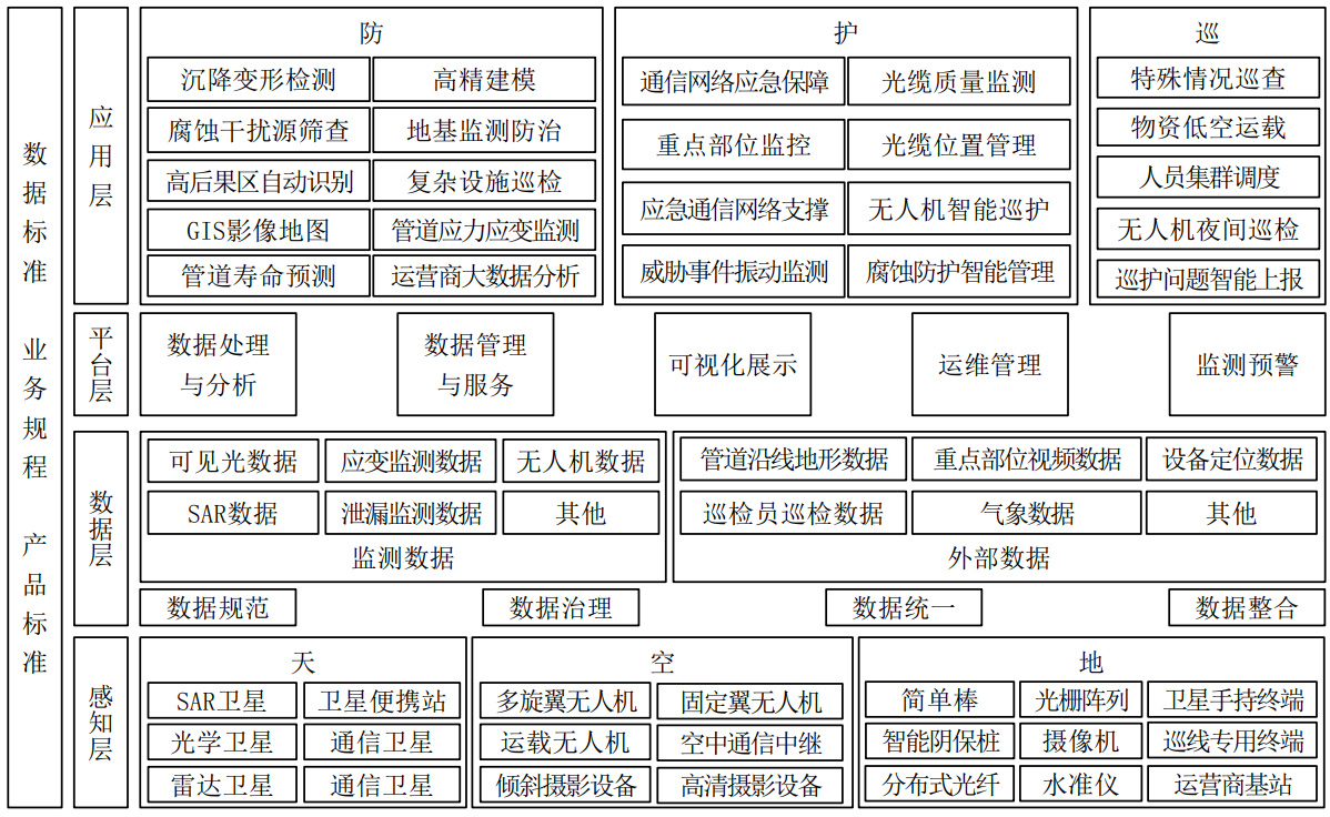 華南公司是目前國內最大的成品油管道儲運企業(yè),建設運營(yíng)著(zhù)近6000千米成品油管道,途經(jīng)廣東、廣西、貴州、云南、四川和重慶,既經(jīng)過(guò)山高谷深、地質(zhì)災害頻發(fā)的西南地區,也經(jīng)過(guò)經(jīng)濟發(fā)達、第三方施工頻發(fā)的珠三角地區,穿越1913條河流,管道安全管理風(fēng)險高。為了保障管道外部安全、降低公共安全風(fēng)險,華南公司以川渝輸油部為試點(diǎn),綜合運用衛星遙感、無(wú)人機、AI 攝像頭等天空地技術(shù),采集多源時(shí)空數據,基于數據挖掘、融合和綜合分析等關(guān)鍵技術(shù),對地災、第三方施工、陰保等類(lèi)危害因素進(jìn)行全天候動(dòng)態(tài)監測和預警,實(shí)現了 “空天地”防護巡一體化(圖 1)。