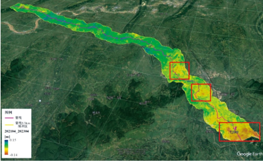 利用 InSAR 衛星技術(shù)可對管道沿線(xiàn)進(jìn)行大范圍地質(zhì)風(fēng)險篩查,快速獲取目標區域的地形、地貌以及表面的微小變化,通過(guò)采集管道沿線(xiàn)區域多個(gè)時(shí)期的 SAR 圖像并進(jìn)行干涉分析,計算出地面沉降和地表形變的速率,生成形變速率專(zhuān)題圖,從而劃分出高、中、低不同的風(fēng)險區域。