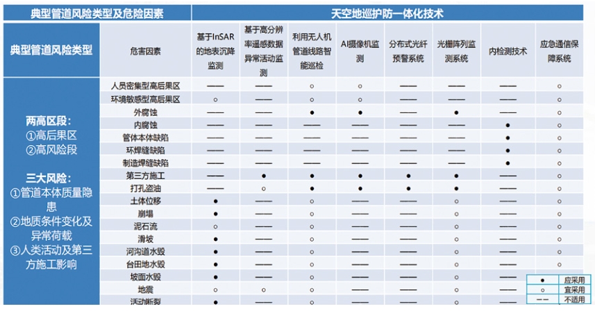 自今年5月應用以來(lái),產(chǎn)生報警信息255條,結合現場(chǎng)核實(shí)不斷修正算法,總體的報警準確率從40%提升至97%。成功預警突發(fā)第三方施工行為10次,成功監測3段管道嚴重地面沉降(圖 2)。根據風(fēng)險預警結果,制定11項重點(diǎn)業(yè)務(wù)管理看板。結合IMS系統動(dòng)態(tài)調整最優(yōu)巡查時(shí)間、巡護關(guān)鍵點(diǎn),優(yōu)化不同時(shí)段巡護任務(wù)414個(gè),累計設置60 049處關(guān)鍵點(diǎn)(遠高于集團每公里2個(gè)關(guān)鍵點(diǎn)的要求),確保風(fēng)險點(diǎn)巡護到位?偨Y形成了風(fēng)險管控技術(shù)矩陣表(圖 3),聚焦4類(lèi)管道、18種風(fēng)險,制定了“天基”衛星、“空基”無(wú)人機、“地基”光纖、視頻AI監測等9項技術(shù)的使用規程,編制天空地防護巡一體化技術(shù)體系標準。
