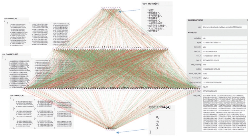 優(yōu)化后的滑坡穩定性模型具有一個(gè)輸入層、兩個(gè)隱藏層、一個(gè)輸出層。每層節點(diǎn)數分別為9、53、82、4,模型概化見(jiàn)圖 4。迭代次數676次、最小損失值0.4642,激活函數relu,輸出激活函數softmax,尋優(yōu)方法adam,學(xué)習率動(dòng)態(tài)自適應。