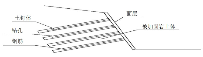 土釘墻的整體形式主要表現為在原狀土體中打孔,然后在預制孔中布置預先設定好的鋼筋后進(jìn)行混凝土注漿,并經(jīng)過(guò)養護使其形成一個(gè)完整且與周?chē)鷰r土體有很好粘結力的結構(圖 1)。同時(shí),在邊坡表面鋪設細小直徑的鋼筋網(wǎng)片,并噴射低強度混凝土來(lái)保護面層,既可以防止土體灑落,也具有一定美化效果。