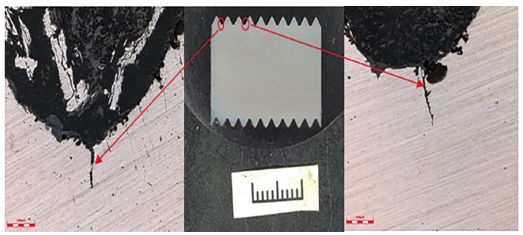 外觀(guān)檢驗發(fā)現失效螺母距螺桿端部距離不一,螺栓末端露出不同螺紋牙數,可推斷出清管器上螺栓初始緊固程度存在差異。失效斷裂發(fā)生在螺紋加工末端齒根位置,螺栓桿體表面未見(jiàn)塑性變形,但存在輕微局部磨損,根據螺栓軸向長(cháng)度推測磨損位置對應螺栓徑向承載位置。斷裂部位附近螺紋齒根部存在微裂紋,斷口呈典型疲勞斷裂特征。