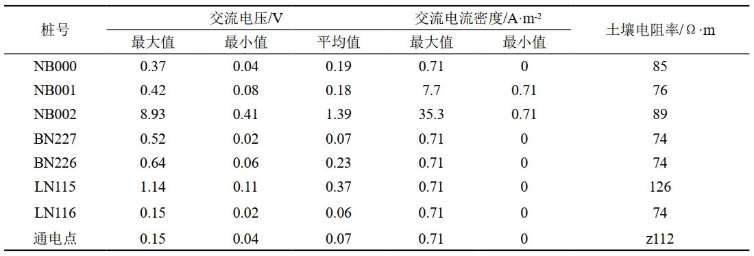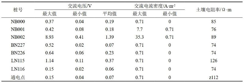 通過(guò)交流檢測數據可以看出,南寧—黎塘管線(xiàn)LN116#~LN115#測試段、南寧—北海管線(xiàn)BN227#~BN226#測試段、南寧—百色管線(xiàn)NB000#~NB002#測試段交流干擾電壓均小于4 V,交流電流密度均小于30 A/㎡,交流干擾程度符合規范要求。