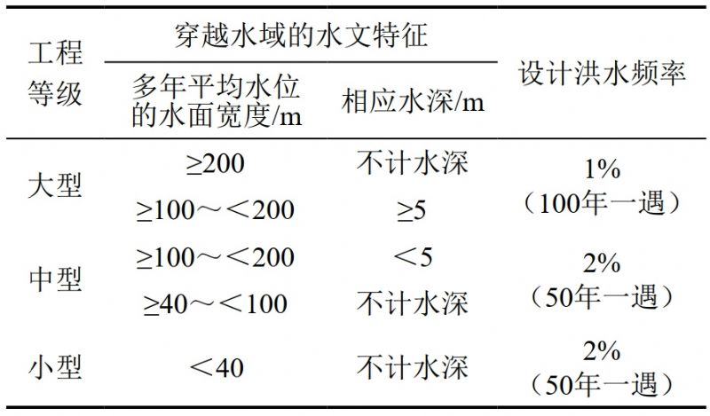 一是GB 50243―2013《油氣輸送管道穿越工程設計規范》表 3.3.3中規定了水域穿越工程,多年平均水位的水面寬度大于等于200 m,不計水深,均為大型工程,設計洪水頻率應選用100年一遇(表 1)。