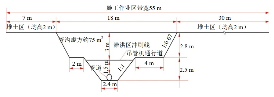 圖 1 滯洪區段管溝斷面及施工作業(yè)帶布置示意圖
