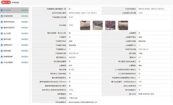 環(huán)焊縫開(kāi)挖復檢管理APP將目標焊口確認、焊縫編號記錄、焊口錯邊情況、本體防腐層修復情況等作為關(guān)鍵質(zhì)量管控環(huán)節,設計現場(chǎng)數據填報+拍攝照片(鏈接時(shí)間水印標簽)、視頻等方式對環(huán)焊縫開(kāi)挖復檢關(guān)鍵過(guò)程進(jìn)行定點(diǎn)記錄,確保關(guān)鍵環(huán)節和隱蔽工程施工記錄真實(shí)可靠。