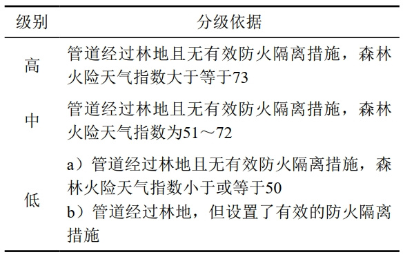 (2)山火易發(fā)性分級。根據全國森林火險天氣等級行業(yè)標準規定的森林火險天氣指數計算標準,結合管道是否采取防火隔離措施,對山火易發(fā)性分為三級(表 1)。