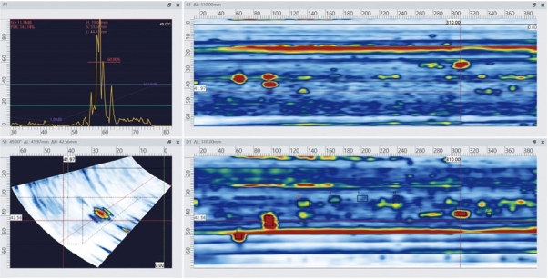 (2)采用相控陣扇形掃查技術(shù),利用優(yōu)化后的檢測試塊進(jìn)行靈敏度校準,可以實(shí)現對主管水平面及焊縫區的覆蓋,缺陷檢出率較高,可滿(mǎn)足工程現場(chǎng)檢測的要求。使用專(zhuān)用的掃查裝置及檢測分析軟件,掃查數據可記錄并保存,后續可以重復對數據進(jìn)行分析。