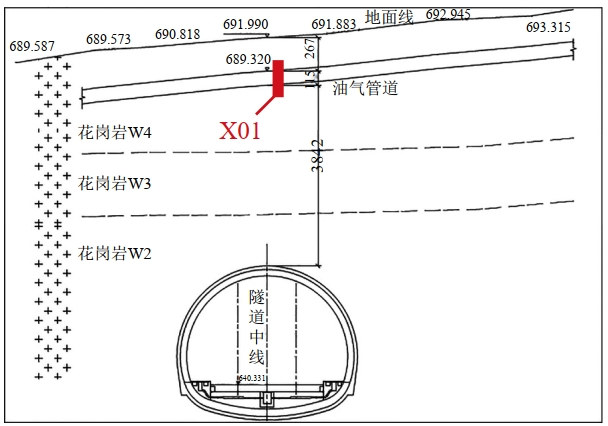 在建龍龍鐵路龍武段雙髻山隧道(以下簡(jiǎn)稱(chēng)雙髻山隧道)位于福建省龍巖市上杭縣蛟洋鎮,在隧道DK 13+450 m處下穿在役西氣東輸三線(xiàn)管道(IB 017+700 m),管徑1219 mm,壁厚18.4 mm,材質(zhì)L555鋼,設計壓力10 MPa,隧道拱頂距離管道最近處約36.7 m,兩者交叉角度為79°。