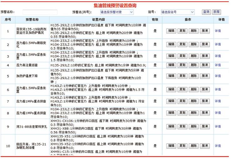 采油管理區運用泄漏監測預警平臺實(shí)現了科學(xué)、規范的管道異常情況報警,根據壓力、溫度等多參數報警信息,及時(shí)綜合研判處理,大幅度提高處置效率,減少了環(huán)境污染,提高了輸油管道安全管理水平。在具體實(shí)踐時(shí),多參數管道泄漏監測預警初期設置可暫定為管道壓力波動(dòng)±5%,然后根據管道運行工況進(jìn)一步優(yōu)化設置。