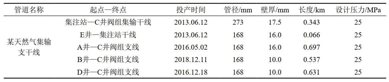 收集某鹽穴儲氣庫15條集輸支干線(xiàn)的基礎數據,以便后續進(jìn)行內腐蝕評估區間劃分。以某天然氣集輸支干線(xiàn)管道為例(表 1),運行壓力5.0 MPa~15.8 MPa,運行溫度為﹣5 ℃~60 ℃。管道的介質(zhì)流向為雙向,注氣過(guò)程是壓縮后的干天然氣從集注站流向各個(gè)氣井,日注氣量為 10×104 m³~340×104 m³(不定期注氣);采氣過(guò)程是各個(gè)氣井采出的濕天然氣流向集注站,日采氣量為10×104 m³~370×104 m³(不定期采氣),基于實(shí)際排污情況進(jìn)行計算,采氣過(guò)程中的含水量為0.01方水/萬(wàn)方氣。