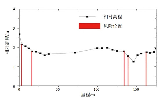 考慮到管線(xiàn)注氣階段的注氣和停輸時(shí)間段,利用流動(dòng)模型,分別分析主要注氣和停輸階段的臨界傾角,管道實(shí)際坡度大于臨界傾角的位置為可能積液的內腐蝕風(fēng)險位置。經(jīng)綜合分析,E井至集注站(注氣方向為從集注站附近三通至E井)的內腐蝕高風(fēng)險點(diǎn)(圖 4)。E井至集注站的內腐蝕高風(fēng)險位置:3±25 m,16±25 m,134±25 m,141±25 m,161±25 m。