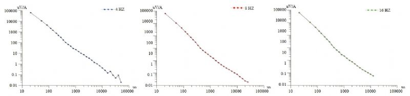 發(fā)射頻率。會(huì )影響探測深度,頻率越低,探測深度越深。4 Hz、8 Hz和16 Hz的響應曲線(xiàn)(圖 3)中可以看到,4 Hz衰減曲線(xiàn)由于采樣周期較長(cháng),造成晚期出現隨機干擾,有效采樣道數變少,證明其頻率不適合本測區的電性反應條件;8 Hz的衰減曲線(xiàn)比較圓滑,較晚的信號出現的波動(dòng)干擾也較小,證明有效信號的總體衰減趨勢特征已經(jīng)被完整采集;16 Hz的衰減曲線(xiàn)更為圓滑,但其衰減曲線(xiàn)的采樣道數只有25道,總采樣道數比8 Hz頻率少3道,證明這個(gè)頻率的采樣周期完成后,有效衰減信號仍然還在延續,說(shuō)明只能采集到衰減信號的前部和中部,較晚的信號無(wú)法獲得,因此會(huì )丟失較深的地層信息。因此,確定選用既能夠將有效的衰減信號采集完整,并且能夠保持較多的采樣道數的8 Hz進(jìn)行數據采集。