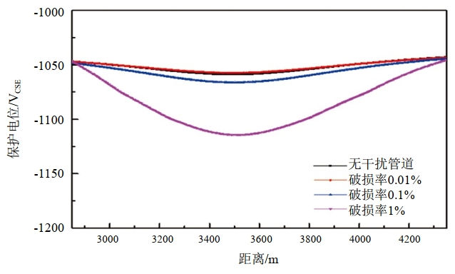 分別模擬計算了無(wú)干擾管道、涂層破損率為0.01%、涂層破損率為0.1%以及涂層破損率為1%時(shí)天然氣管道的電位,當受干擾管道涂層破損率為0.01%和0.1%時(shí),相對于無(wú)干擾管道時(shí)其電位負向偏移程度不太明顯,而當涂層破損率為1%時(shí),受干擾管道的電位比無(wú)干擾管道電位負向偏移更多(圖 3)。此外,當防腐層破損率越大時(shí),裸露的金屬面積越大,即防腐層面電阻率越低,則防腐層單位破損面積流入或流出的電流越少,管道受干擾程度越輕。
