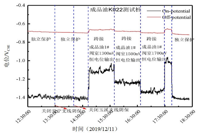 可以看出,跨接前后測試樁通斷電電位變化顯著(zhù)。相比C站干線(xiàn)陰極保護系統上下游多套陰極保護系統相互影響,B原油支線(xiàn)和F天然氣支線(xiàn)陰極保護系統較為單一,跨接試驗前后已將其關(guān)閉,因此跨接后B原油支線(xiàn)、F天然氣支線(xiàn)和成品油干線(xiàn)電位變化顯著(zhù)。當1#成品油閥室恒電位輸出1300 mV時(shí),K016測試樁處B原油支線(xiàn)、F天然氣支線(xiàn)和成品油干線(xiàn)電位均能滿(mǎn)足標準要求,其有效保護范圍約3 km,并且管道沿線(xiàn)K019和K022測試樁處仍然有一定保護效果,但其管道斷電電位已經(jīng)不滿(mǎn)足標準﹣850 mV準則。繼續增大1#成品油閥室輸出至1500 mV和1700 mV,靠近跨接點(diǎn)的B原油支線(xiàn)、F天然氣支線(xiàn)和成品油干線(xiàn)K015和K016測試樁處陰極保護效果有部分提升,但遠離跨接點(diǎn)的K019和K022測試樁保護效果無(wú)明顯提升。其結果說(shuō)明跨接能有效提升原本陰極保護水平較差的F天然氣支線(xiàn)的陰極保護效果,但是單靠單點(diǎn)的跨接作用的范圍較為有限,無(wú)法使管道沿線(xiàn)電位均達到標準要求。