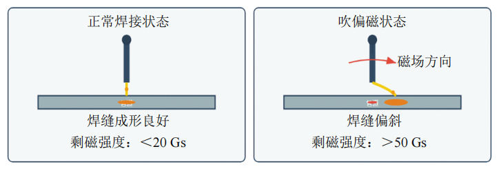 在氬弧焊接過(guò)程中,焊接電弧本質(zhì)上是高溫等離子體流,由電極與工件之間的高電壓擊穿空氣形成。當管道存在較強的剩磁時(shí),磁場(chǎng)會(huì )作用于電弧,產(chǎn)生洛倫茲力,迫使電弧偏離焊縫中心,即所謂“電弧偏吹”現象(圖 1)。這種干擾會(huì )使焊縫金屬熔深不均,根部成型困難,導致“未焊透”“燒穿”“咬邊”等缺陷,嚴重時(shí)甚至無(wú)法穩定引弧,直接影響焊接作業(yè)開(kāi)展。已有研究指出,電弧偏吹現象的嚴重性與剩磁分布及磁通方向密切相關(guān),合理消磁處理是提升焊縫質(zhì)量的關(guān)鍵[2]。