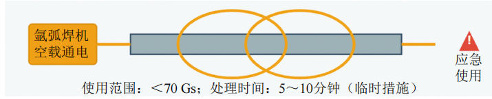 (2)分類(lèi)制定消磁操作規范。根據工作實(shí)踐,總結出一套可復制的消磁方法分類(lèi)標準,結合管徑、材質(zhì)與磁場(chǎng)強度建立“剩磁等級判定與操作指南”。如:輕度剩磁(<50 Gs):直接采用交流消磁;中度剩磁(50 Gs~100 Gs):選擇直流或組合方式;重度剩磁(>100 Gs):配合屏蔽罩、搭橋導磁等手段分步驟退磁;并同步制定“應急消磁SOP卡片”,張貼于作業(yè)車(chē)或集控車(chē)間,指導現場(chǎng)快速決策。