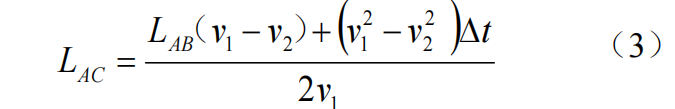 圖 1中原油管道長(cháng)度為L(cháng)AB,m;模擬泄漏點(diǎn)為C。泄漏點(diǎn)C產(chǎn)生的壓力波傳到首站A點(diǎn)的時(shí)刻設為 t1,s;傳到末站B點(diǎn)的時(shí)刻為 t2,s;已知原油管道的長(cháng)度和輸送的介質(zhì),忽略原油的黏度、溫度、流動(dòng)狀態(tài)等因素的影響,壓力波在原油中的傳播速度為 v1,m/s;原油在管道的流速為v2,m/s。則: