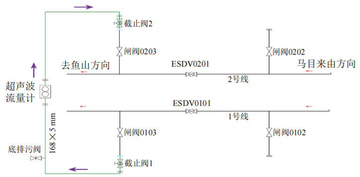 由于該輸油管道是雙管同溝敷設,在輸油管道沿途的其中1個(gè)閥室進(jìn)行工藝改造,1號、2號管線(xiàn)旁通管線(xiàn)平板閘閥0103和0203處,拆掉目前封堵的盲法蘭,安裝好臨時(shí)工藝閥組和截止閥,模擬泄漏試驗工藝閥組安裝位置如圖 2綠色管線(xiàn)位置所示。