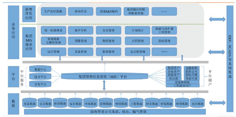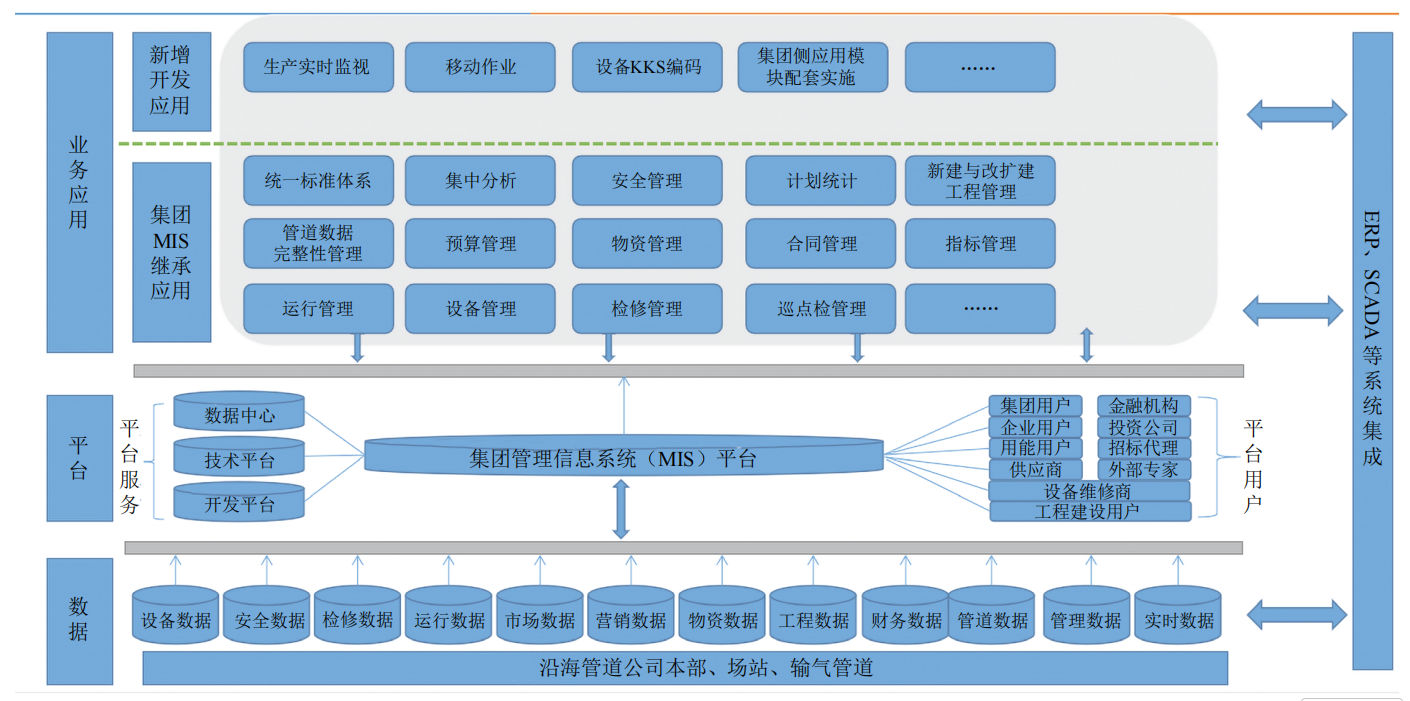 (3)信息化應用程度不高 。公司MIS(Management Information System)管理信息系統(圖 3),一方面充分利用集團已建MIS成果,在現有基礎上擴展、深化;另一方面,要根據沿海管道公司業(yè)務(wù)特點(diǎn)進(jìn)行針對性開(kāi)發(fā)。目前處于運營(yíng)初期階段,信息化建設項目零散且缺乏整體協(xié)調,尚不具備數據分析等功能,員工應用尚不夠熟練,信息化工具的應用有待進(jìn)一步開(kāi)發(fā)完善。