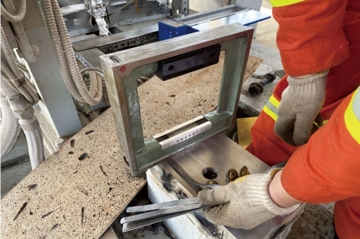 針對以上問(wèn)題,檢修人員決定采用基礎調平的方法,對基礎進(jìn)行修復打磨或重建基礎平面,使其平面度偏差≤0.1 mm/m,有效改善振動(dòng)影響,F場(chǎng)采用角磨機切割電機基礎上的支墩墊塊,送往機械加工廠(chǎng)進(jìn)行車(chē)削研磨(圖 2);使用框式水平儀輔助校正并重新焊接,同時(shí)測量基礎各點(diǎn)水平度(圖 3);利用塞尺檢測電機底座與基礎間的間隙,判斷平面度偏差,隨后恢復設備并進(jìn)行機組對中、啟機測試。