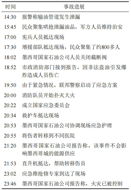 事故管道為墨西哥國家石油公司(Pemex)Tula煉油廠(chǎng)從墨西哥灣海岸至墨西哥城輸送汽油的陸上常溫成品油干線(xiàn)管道,全長(cháng)270 km、管徑324 mm、管材API 5L X52、壁厚6.4 mm、運行壓力2 MPa。起初泄漏規模較小為“小水坑”,后如“噴泉”般涌出,噴射高度6 m左右,當地約800多名居民蜂擁而上,用水桶、垃圾桶等非防爆容器哄搶泄漏油品,引起爆炸并導致火災。事故發(fā)生的主要時(shí)間線(xiàn)如表 1所示。