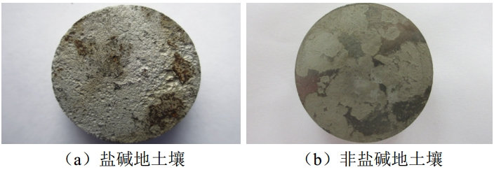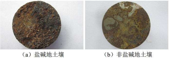 選用材質(zhì)為X65管線(xiàn)鋼,裸露面積為6.5 cm2的圓形試片, 其主要化學(xué)成分(質(zhì)量分數%)為: C 0.03,Si 0.17,Mn 1.51,P 0.024,Ni 0.17,Cu 0.04,Mo 0.16等。取某鹽堿地現場(chǎng)土壤樣品,以北京市昌平區非鹽堿地土壤為對照試樣,于實(shí)驗室進(jìn)行理化性能測試(表 1)。表明鹽堿地土樣的HCO3-、 Cl-、SO42-、pH明顯高于對照土樣;兩種土壤成分可以代表典型鹽堿地和非鹽堿地土壤條件。