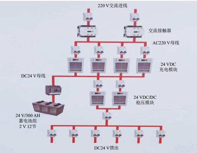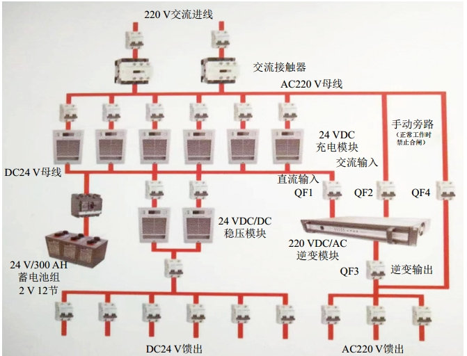 直流電源1所供負載為通信設備及攝像頭,6路充電模塊并聯(lián)運行,互為備用,支持熱插拔。并配置雙電源逆變器一臺,用于給使用220 V交流電壓的設備供電,該逆變器在有市電時(shí)使用市電工作,當市電中斷時(shí)自動(dòng)切換為使用蓄電池組提供的24 V直流電源工作,需要檢修時(shí)可以使用手動(dòng)旁路開(kāi)關(guān),將逆變器拆除進(jìn)行維修;直流電源2所供負載為自動(dòng)化設備,全部使用24 V直流電源工作,4路充電模塊并聯(lián)運行,互為備用,支持熱插拔。